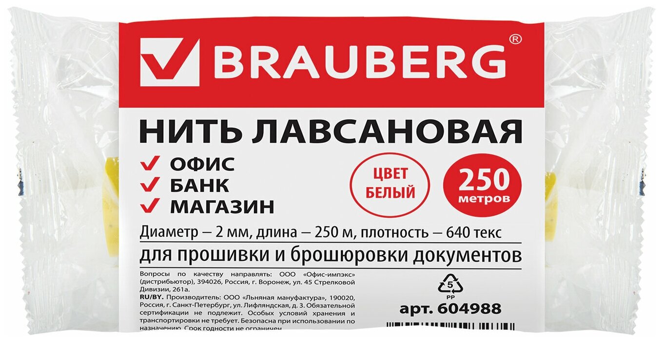 Mylar thread for stitching Brauberg documents, diameter 2 mm, length 250 meters, white LS 640