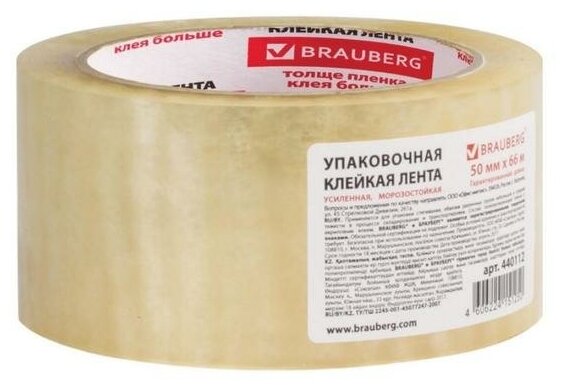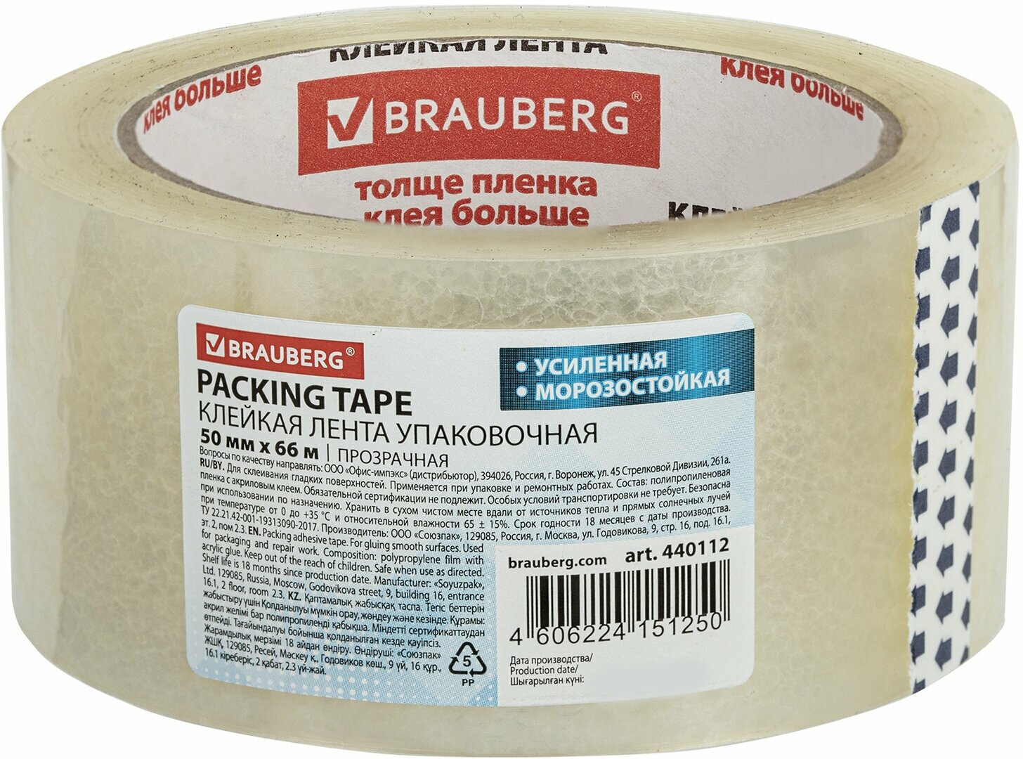Adhesive packing tape 50 mm x 66 m, transparent, REINFORCED, FROST-RESISTANT, thickness 50 microns, BRAUBERG, 440112