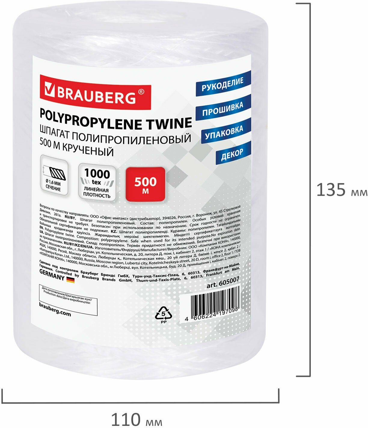BRAUBERG Polypropylene twine, length 500 m, diameter 1.6 mm, linear density 1000 tex, brauberg, 605007