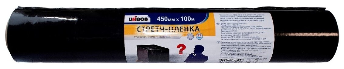 Type: film, material: polyethylene, film type: stretch film, release form: roll, length: 100000 mm, width: 450 mm, height: 126 mm, thickness: 23 mm