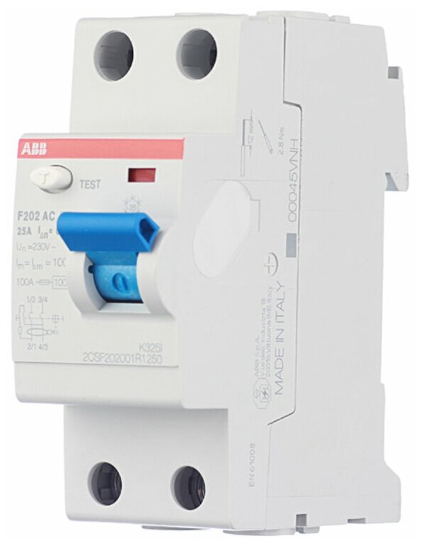 Leakage current: 30 mA, number of poles: 2, rated voltage: 230 V, number of modules: 2, rated breaking time: 20 ms, operating principle: electromechanical, type: AC, protection class: IP2X