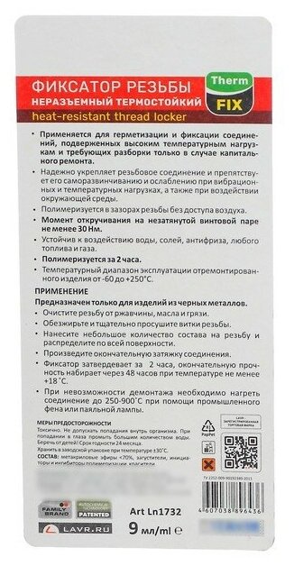 LAVR LN1732 LN1732_one-piece thread lock, heat-resistant, thermfix, up to 250C, 9 ml\