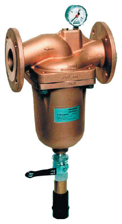 Flanged DN100 fine filter with backwash, installed in a horizontal pipeline with a bowl down; in 2020 there was a change of the Honeywell brand to Resideo Braukmann without changing the characteristics