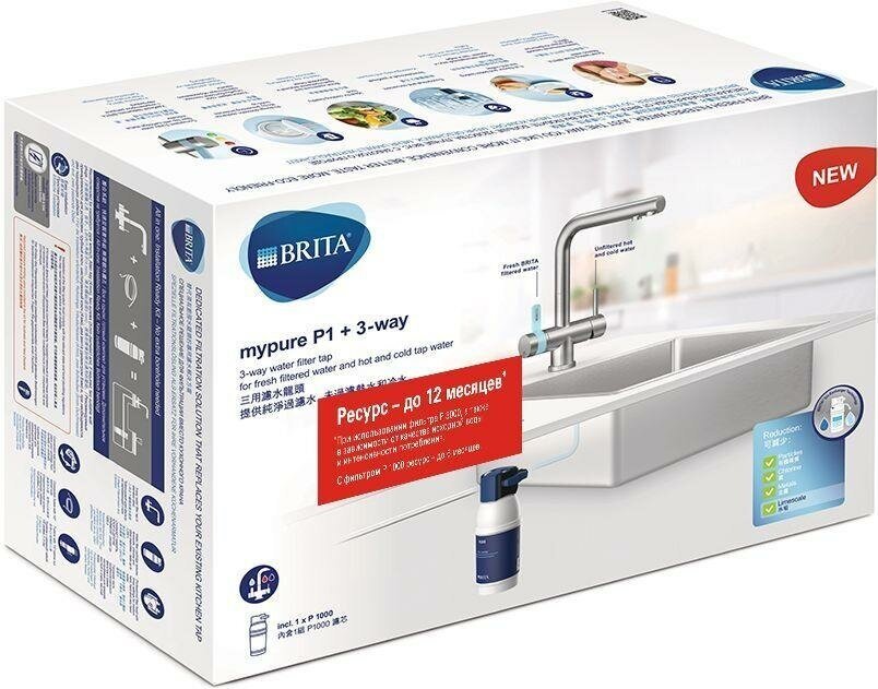 Complete set: filter P1000, 3-way mixer BRITA 2 in 1, professional filter head, LED indicator, reinforced hoses for connection, tee, wall mount, gaskets, nuts, washers for installation, instruction, test