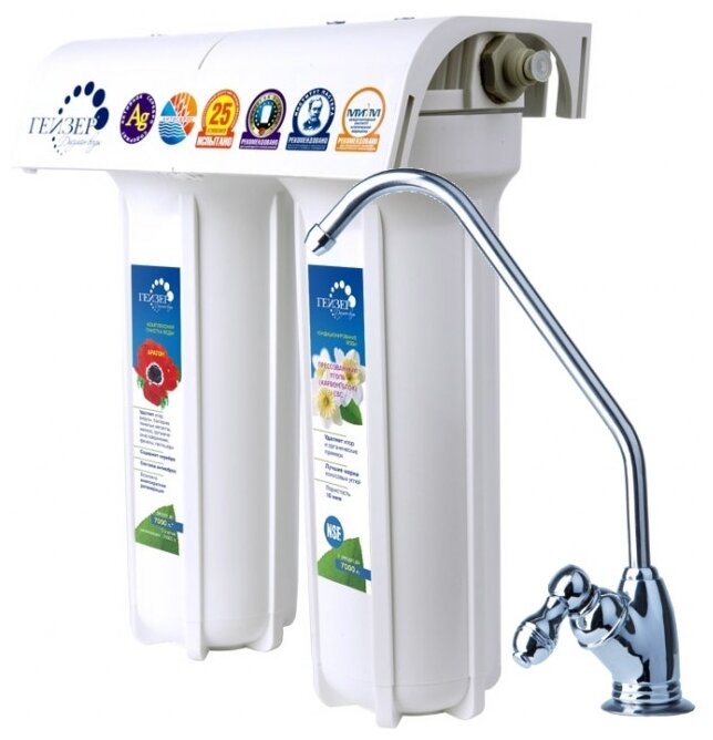 For hard water, the first stage - filter element "Geyser" for hard water, the second - coal SHS; "John Guest" type plastic inlet quick-detachable inlet connections for easy and quick filter installation