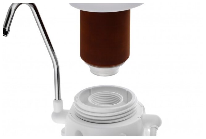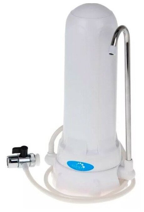 Connects to a tap with a thread through a diverter-aerator, a calcium and magnesium dispenser, an Aragon M polymer cartridge that provides both sorption and ion exchange