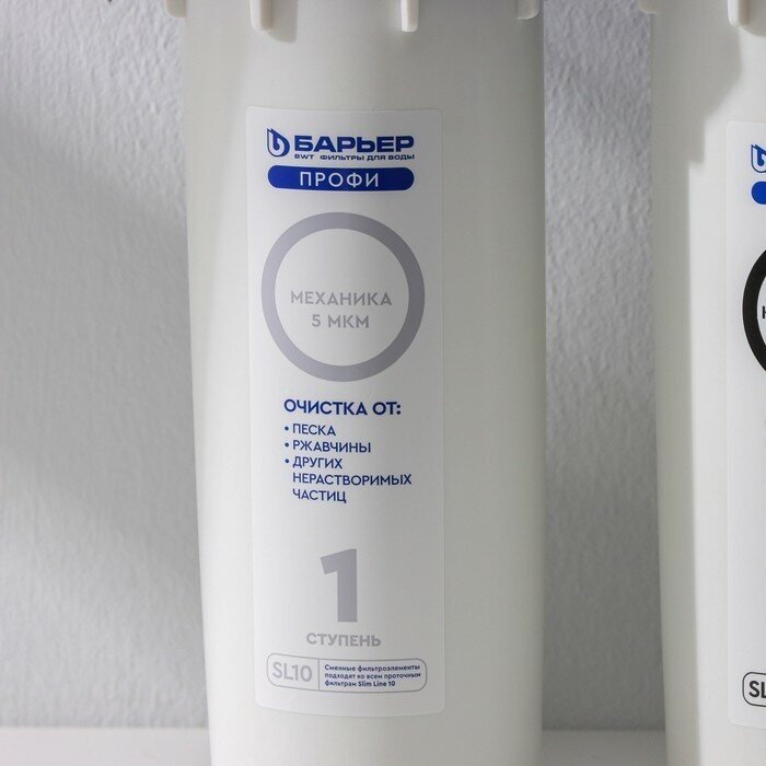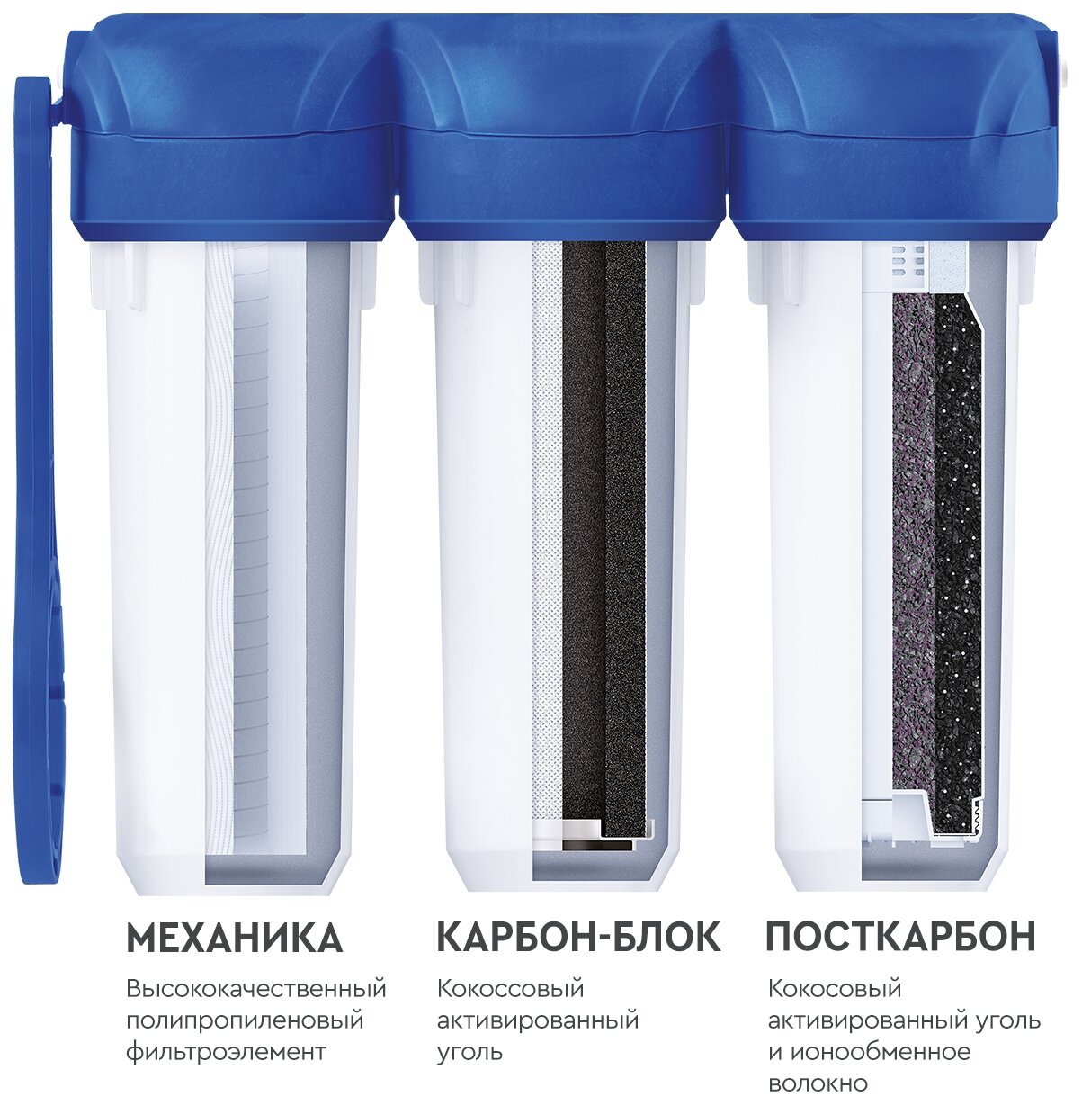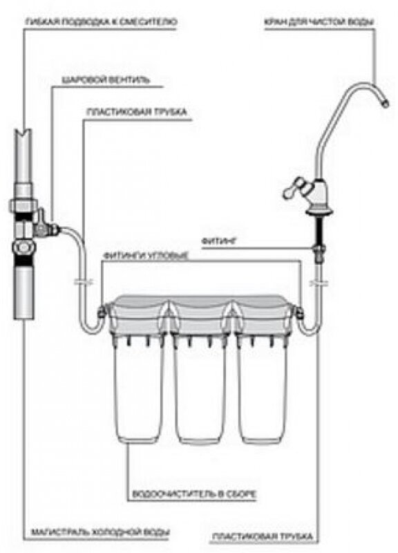 Complete set: water purifier assembled with a set of filter elements; faucet for clean water with gaskets, washers, nut; connecting tubes, 1 m 2 pcs.; plastic key to replace filter elements; faucet fitting for