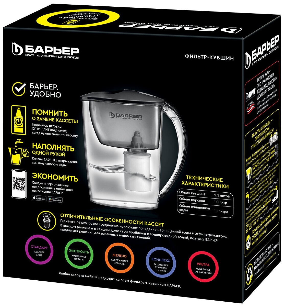 Filter type: jug, type: filter, cleaning functions: mechanical filtration, features: transparent housing, water type: cold, container volume: 2.50 l, functions: iron removal, free chlorine removal