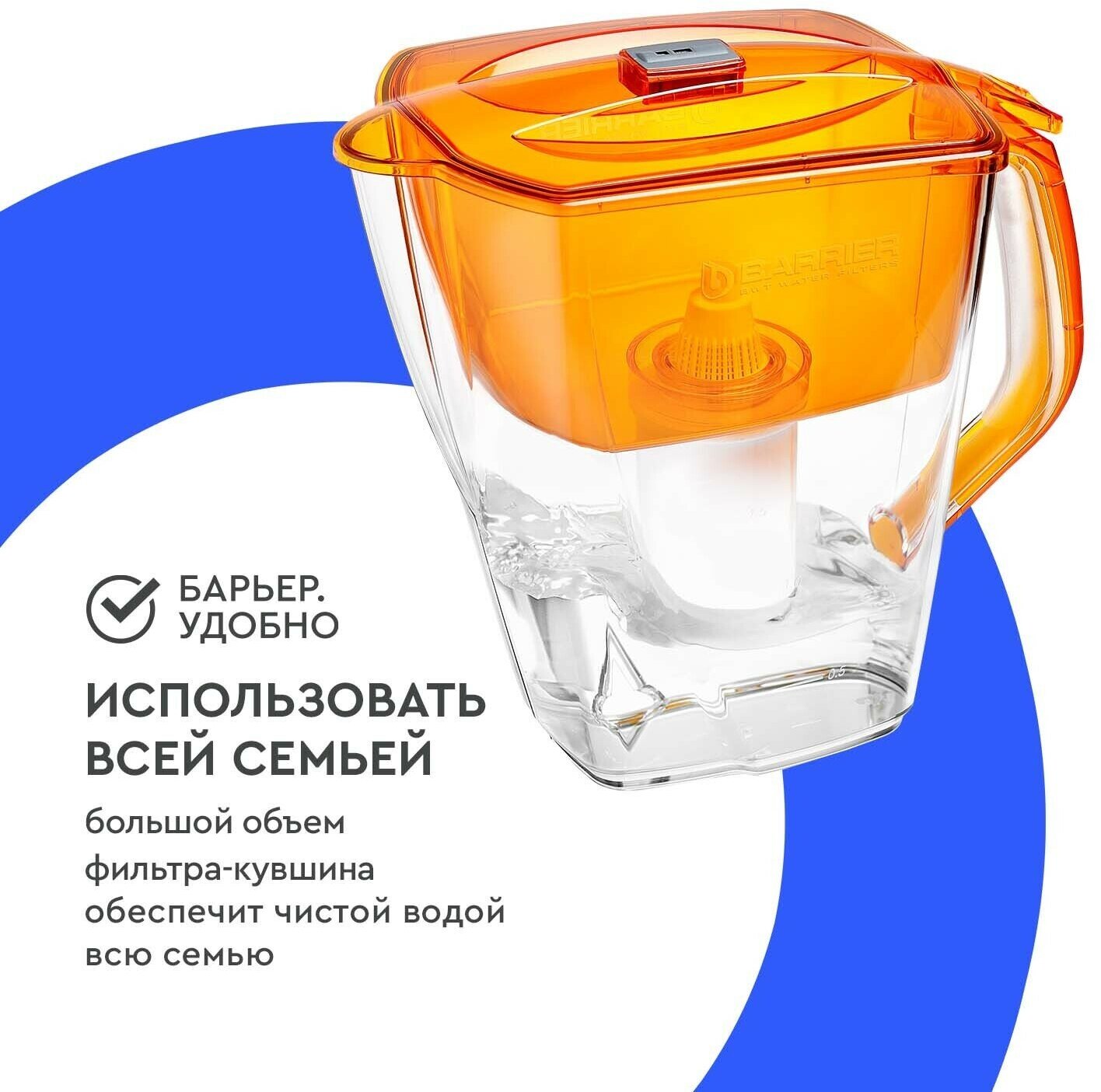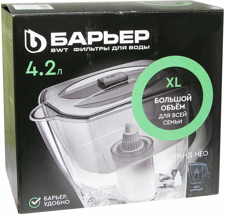 Volume of filtered water: 2 l; funnel volume: 1.7 l; compatible with all interchangeable cassettes Barrier; delivery of different configuration options is acceptable - with a “standard” cassette or a “rigidity” cassette