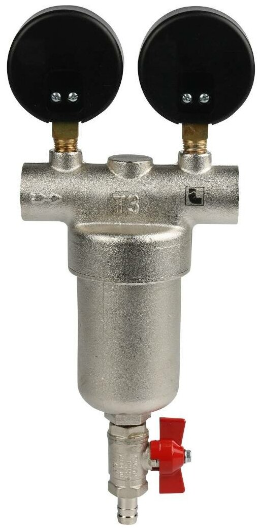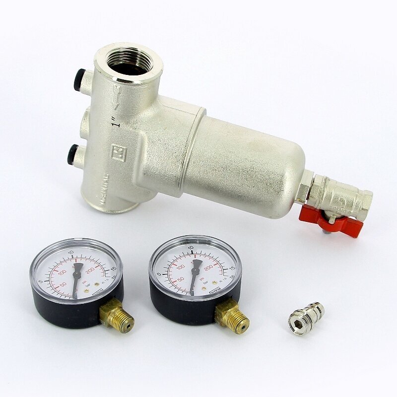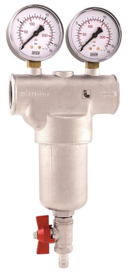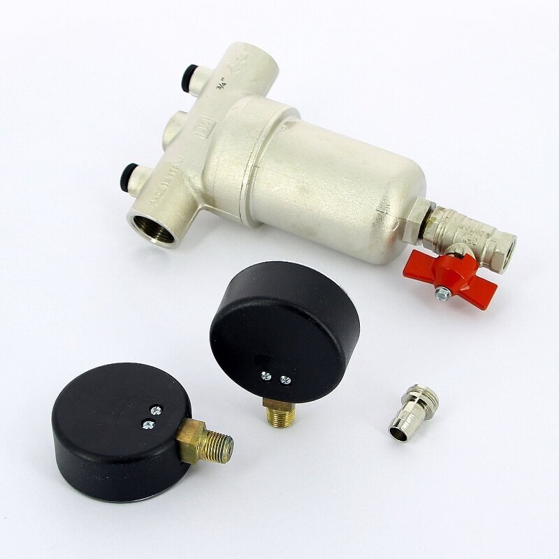 Body material: brass, connection type: socket BP/BP, nominal pressure: PN 16, cell size: 100 microns, options: pressure gauge, drain