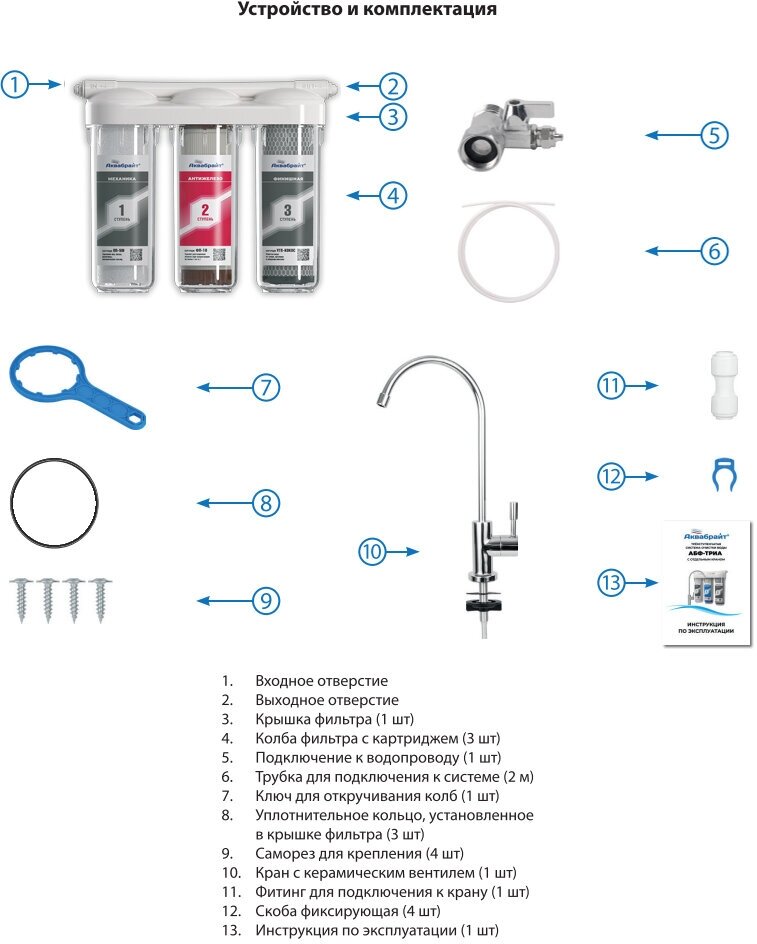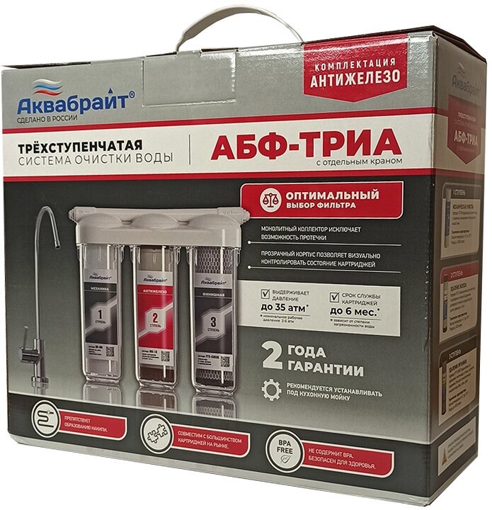 Filter type: "under the sink" system, type: filter, cleaning functions: iron removal, free chlorine removal, features: connection to the water supply, transparent housing, Separate faucet, number of purification stages: 3, water type: