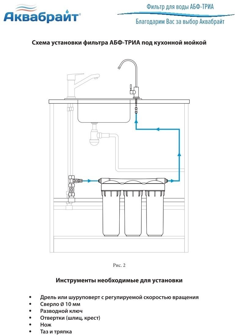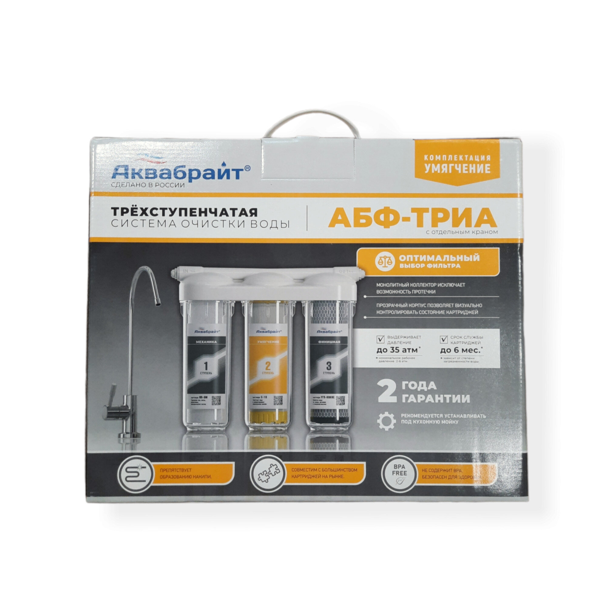 The water purification system is designed to purify cold water from organochlorine compounds, iron, pesticides, heavy metals, bacteria, viruses and soften. Purified water is intended for drinking, cooking