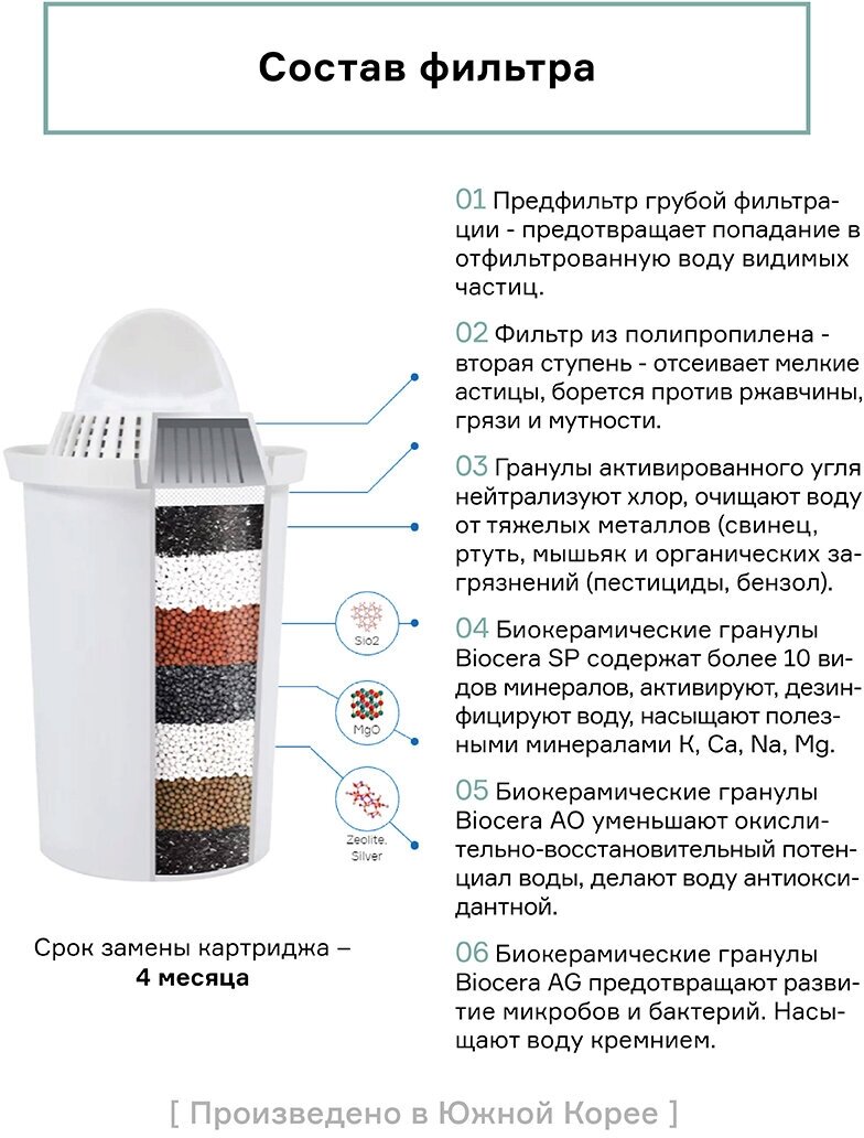 Filter type: jug, type: filter, cleaning functions: ion exchange, mineralization, features: transparent body, water type: cold, functions: mineralization, iron removal, free chlorine removal, softening