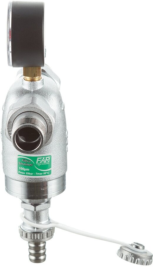 Body material: brass, connection type: socket male/male, mesh size: 100 µm, options: pressure gauge
