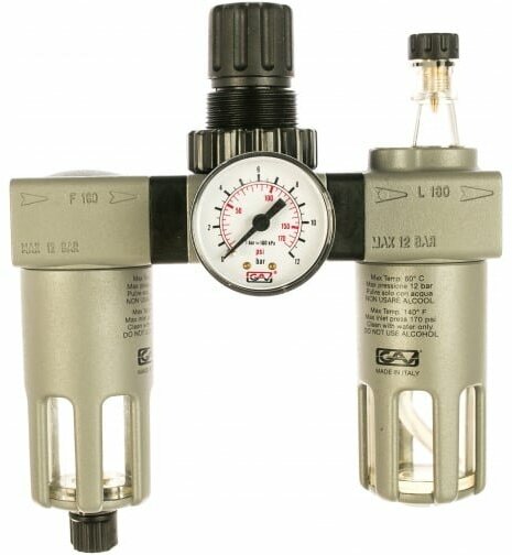 Type: filter/reducer/lubricator, filter type: air, operating pressure: 12 atm, inlet connection diameter: 1/4F, outlet connection diameter: 1/4F