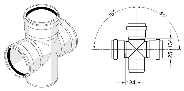 Fitting type: single-plane cross, angle: 45, nominal bore: 110, connection method: socket, material: polypropylene, type of sewerage: internal