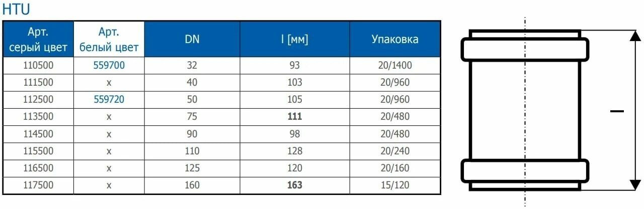 Fitting type: coupling, coupling type: sliding, nominal bore: 32, connection method: socketless, material: polypropylene, type of sewerage: internal