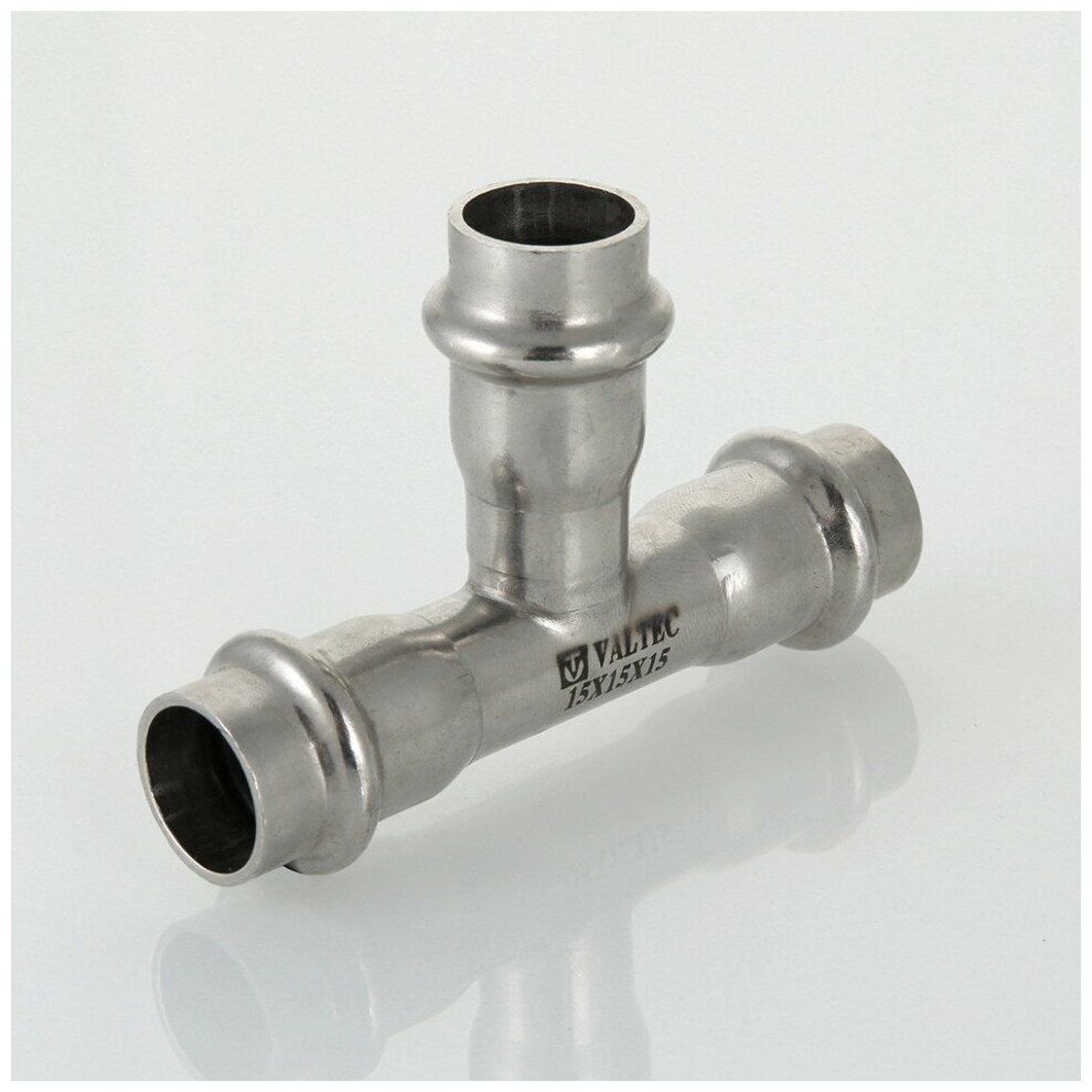 Type: tee, connection type: press, pipe diameter: 15 mm, 28 mm, material: stainless steel, transition
