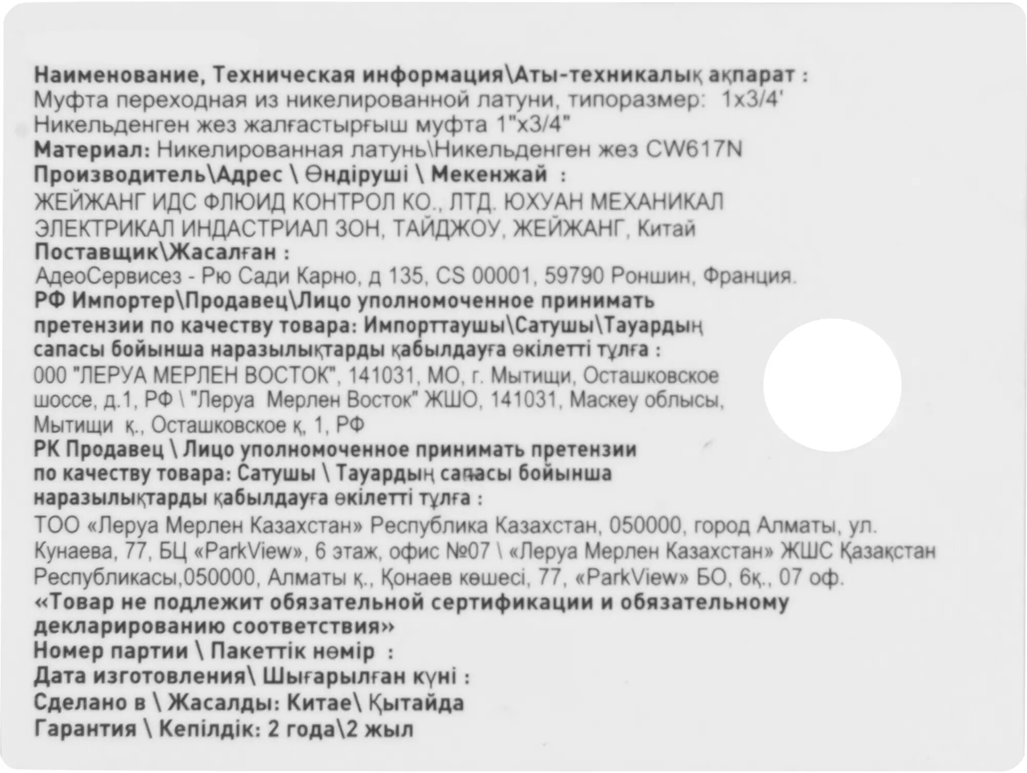 Type: adapter, connection type: thread, connection: female, material: nickel-plated brass, adapter