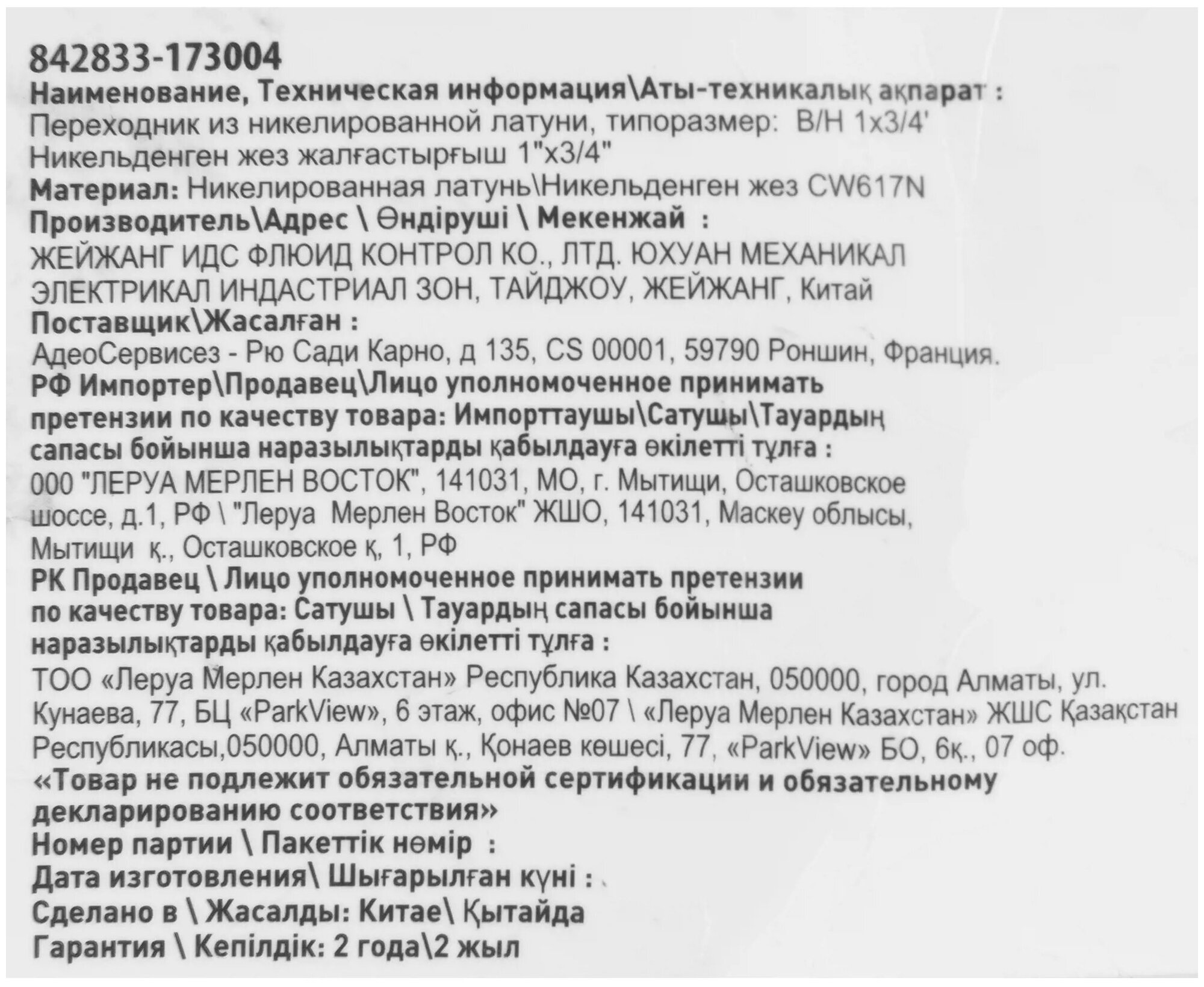 Type: adapter, connection type: thread, connection: external / internal, material: nickel-plated brass, adapter