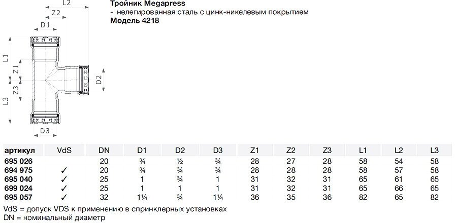 Tee Viega Megapress SC-Contur 695057 1 1/4 x 3/4 x 1 1/4 press unalloyed galvanized steel