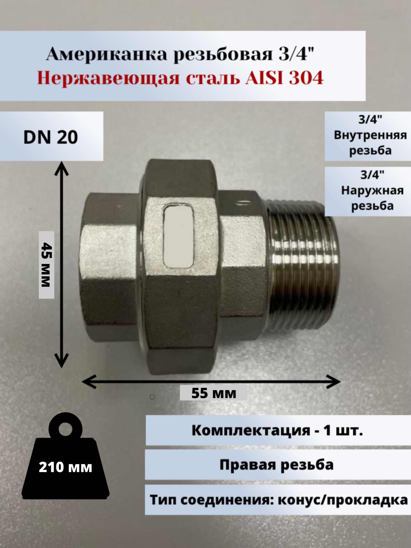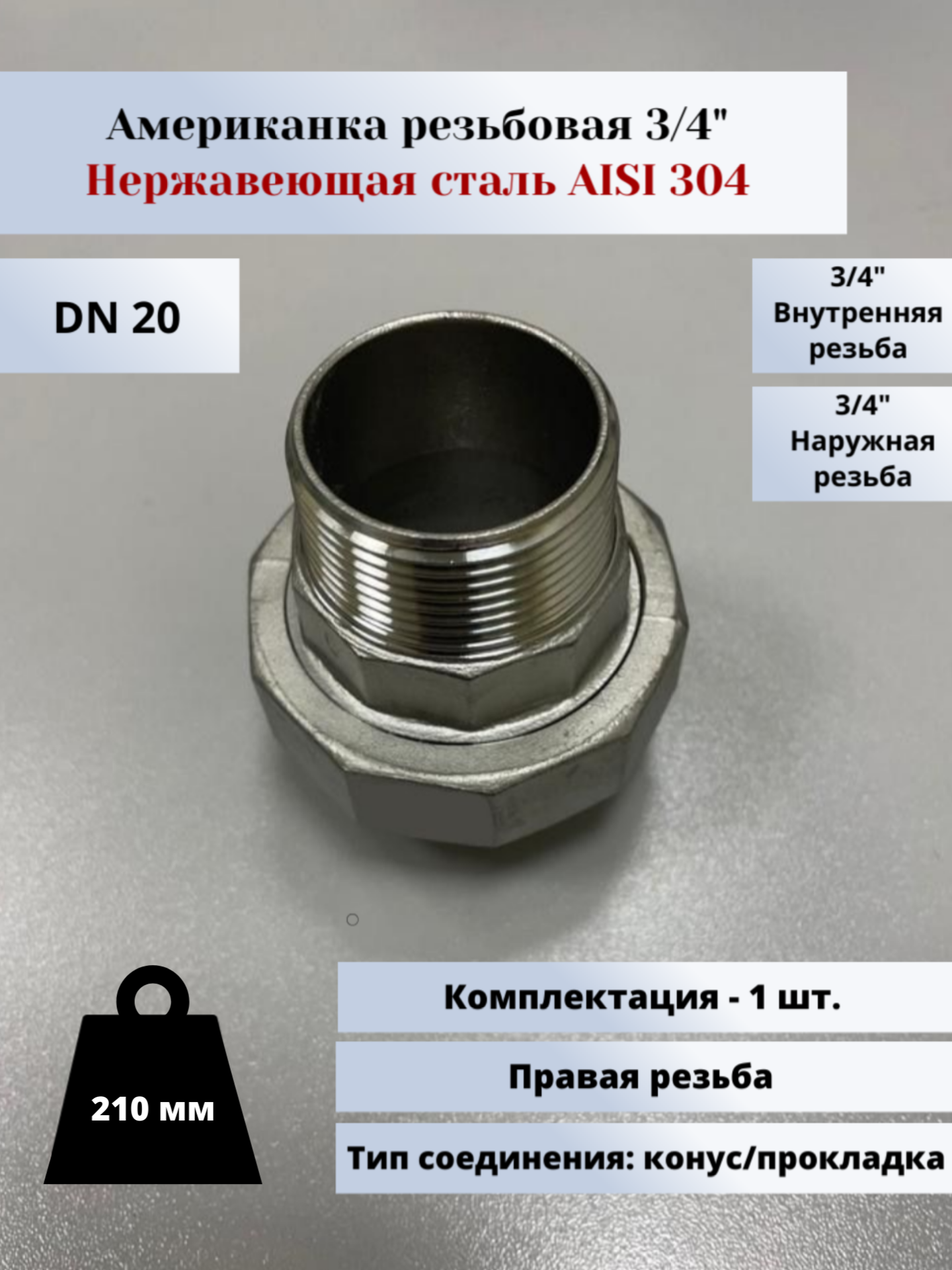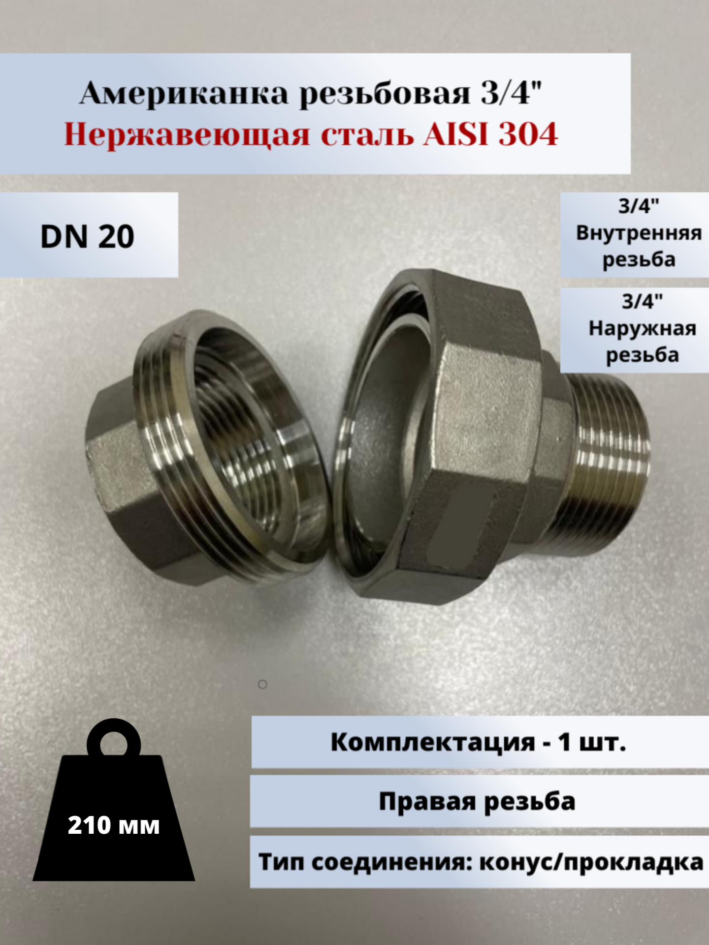 Type: American plug connection, connection type: thread, connection: male / female, press fitting profile: not applicable, pipe diameter: 3/4", material: stainless steel, split, with union nut