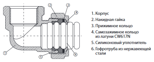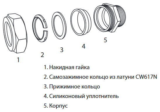 Brass CW617N; operating temperature, °С from -50 to +110; maximum short-term allowable temperature: 150°С; seal material: silicone rubber; production method: hot stamping; maximum working pressure,