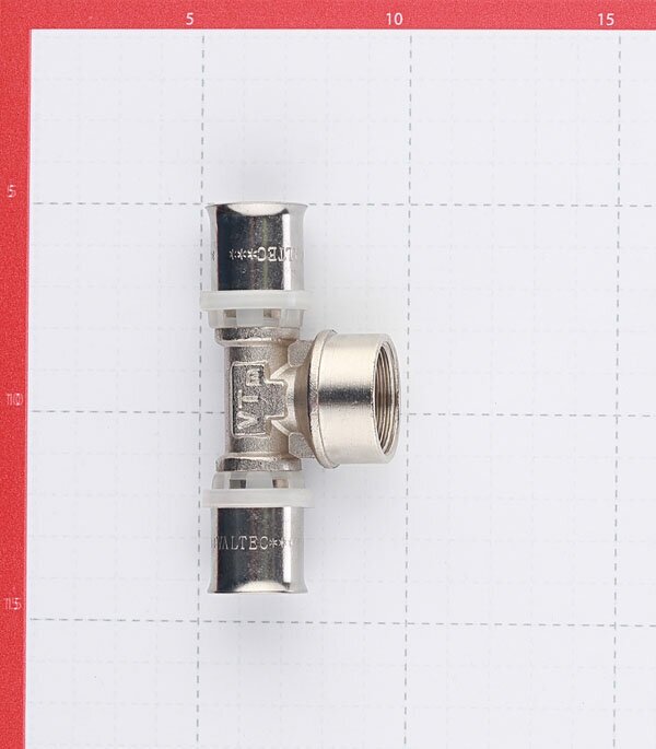 Type: tee, connection type: press-thread, connection: female, press fitting profile: TH, thread diameter: ¾", pipe diameter: 20 mm, pipe thickness: 2 mm, material: nickel-plated brass, with seal, combined