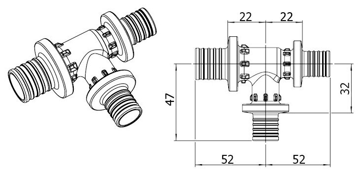 Type: tee, connection type: press, connection: male, pipe diameter: 16 mm, 32 mm, material: polyphenylsulfone PPSU, adapter