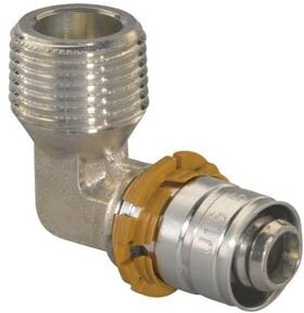 Type: elbow 90°, connection type: press-thread, connection: male, thread diameter: ½", pipe diameter: 16 mm, material: brass, combined