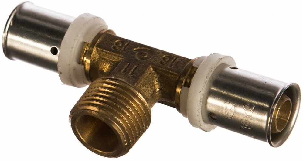 Type: tee, connection type: press-thread, connection: male, press fitting profile: TH, thread diameter: ½", pipe diameter: 16 mm, pipe thickness: 2 mm, material: brass, with seal, combined