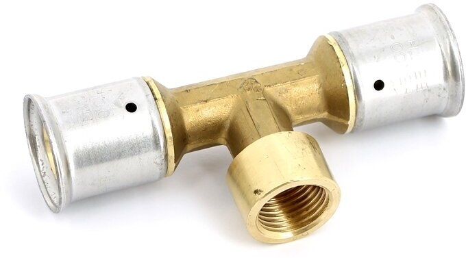 Type: tee, connection type: press-thread, connection: female, thread diameter: ½, pipe diameter: 20 mm, pipe thickness: 2 mm, material: brass, with seal, combined