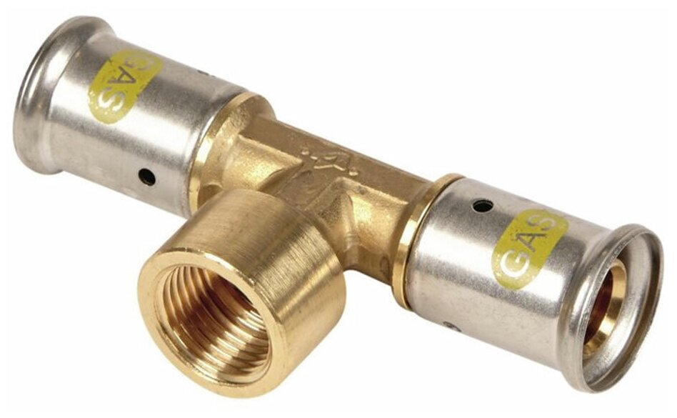 Type: tee, connection type: press-thread, connection: female, thread diameter: ½", pipe diameter: 26 mm, pipe thickness: 3 mm, material: brass, with seal, combined