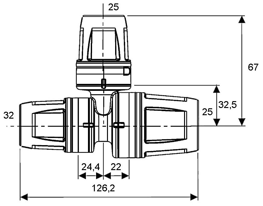 Type: tee, connection type: clamp, connection: female, pipe diameter: 25, 25, 32, 32, material: PPSU, reducer