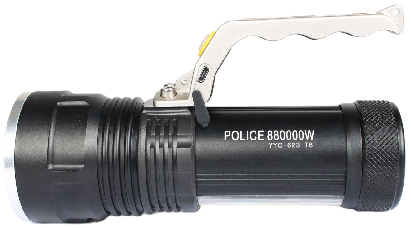 Type: hand lamp, light source: LEDs, power type: built-in battery, power consumption: from USB, features: high beam, flashing, searchlight, economy mode, luminous flux: 8000 lm, lighting range