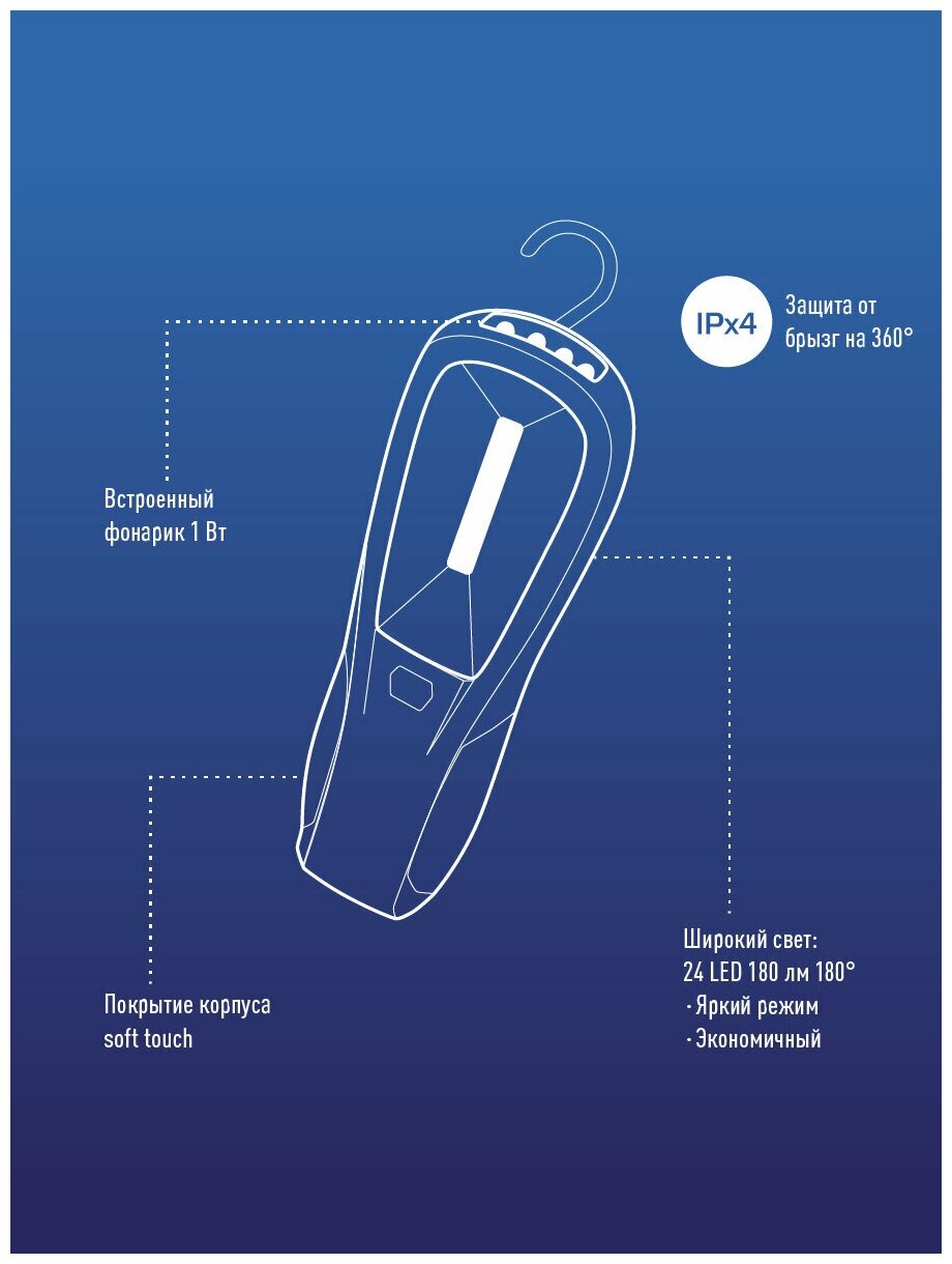 Type: camping lantern, light source: LEDs, power type: batteries, features: moisture protection, impact-resistant housing, luminous flux: 180 lm, housing material: plastic, weight: 165 g