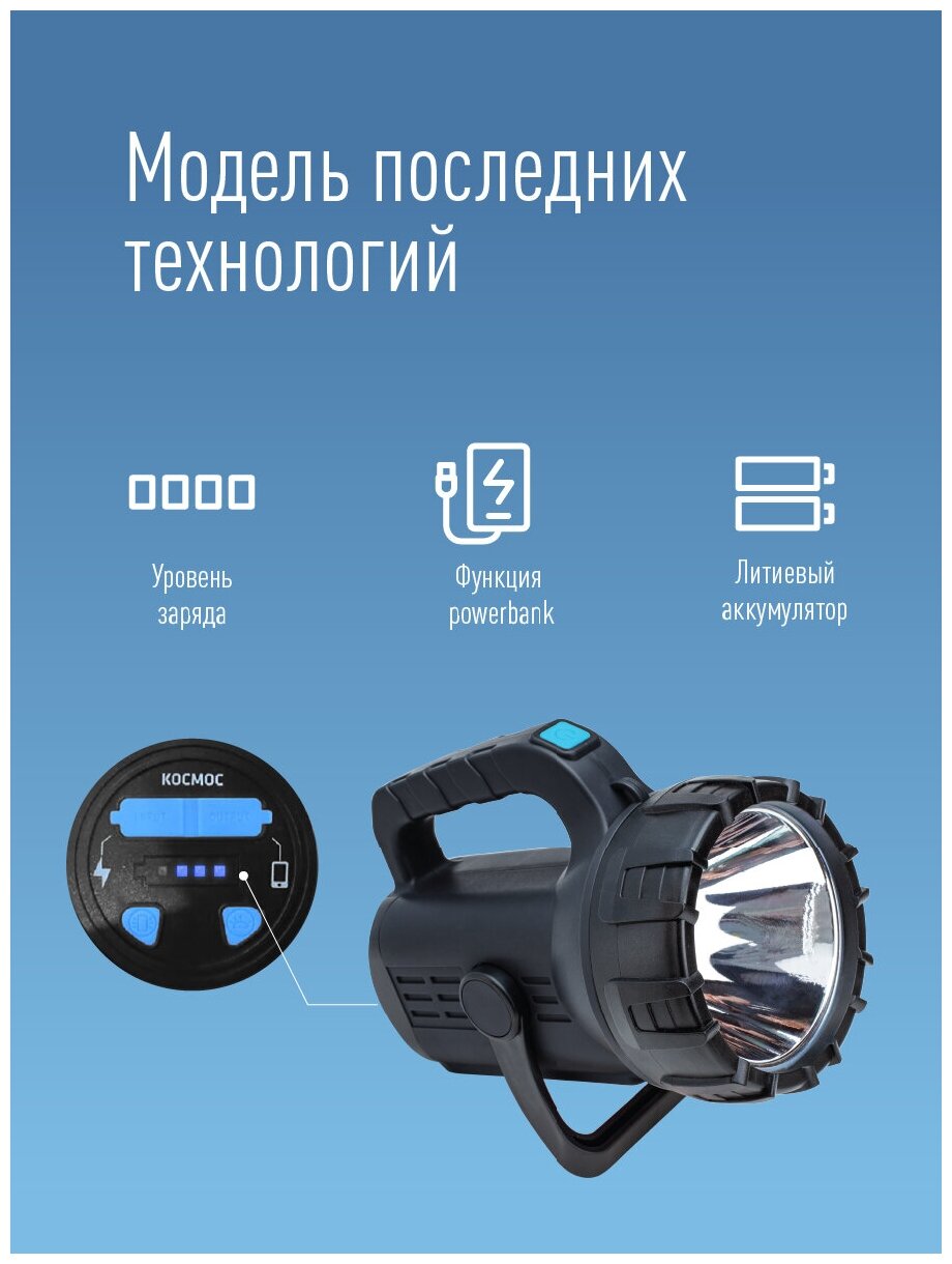 Peculiarities: Batteries, moisture protection, built-in power bank, high beam, daylight white light, charge indication, red light, flashing, rubber-coated housing, spotlight, signal mode, strobe, shockproof housing, economy mode