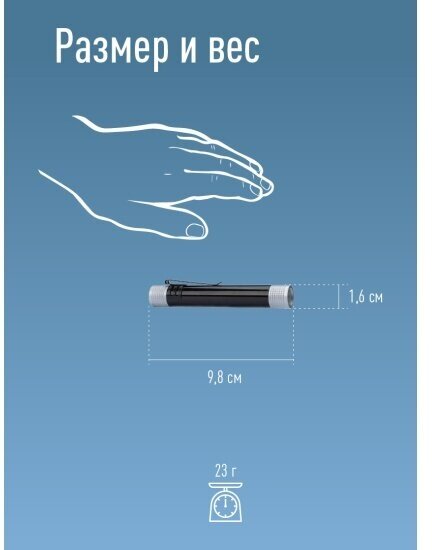Type: hand torch, light source: LEDs, power type: battery, features: high beam, daylight white light, luminous flux: 25 lm, lighting range: 25 m, housing material: aluminum, plastic, weight: 23 g