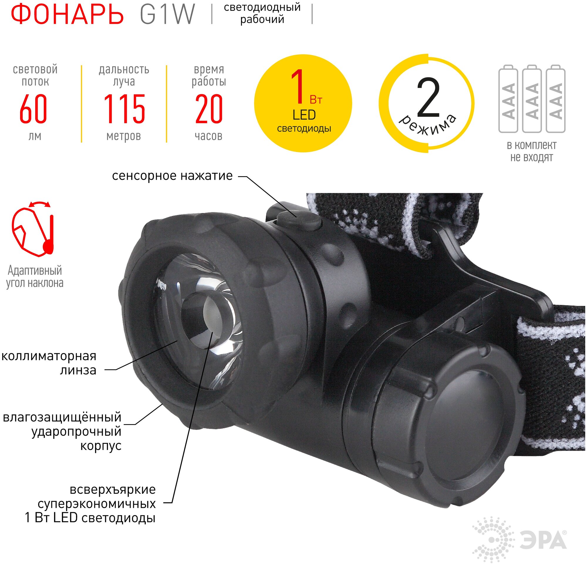Type: headlamp, accessory type: flashlight, light source: LED, power type: battery, features: high beam, warm white light, shockproof housing, impact resistance, luminous flux: 60 lm, illumination range