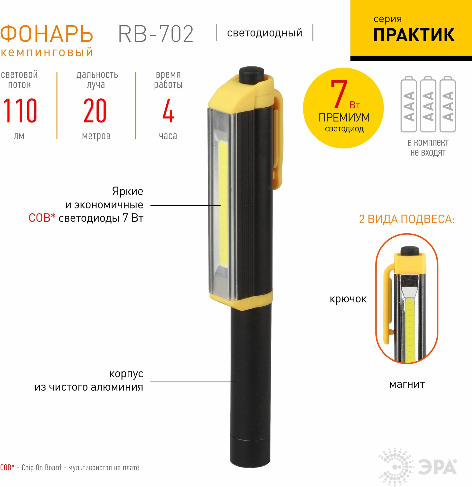 Type: hand torch, light source: LEDs, power supply: battery, features: yellow light, luminous flux: 200 lm, lighting range: 25 m, maximum operating time: 4 h, body material: aluminum, weight: 90 g