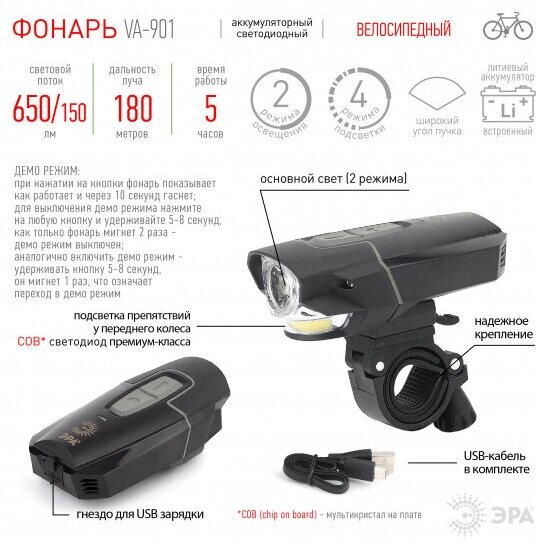 Lamps included - Yes; battery type: Li-ion; detailed complete set: Bicycle LED lamp - 1 piece; number of operating modes: 4; power consumption: from the network, from USB