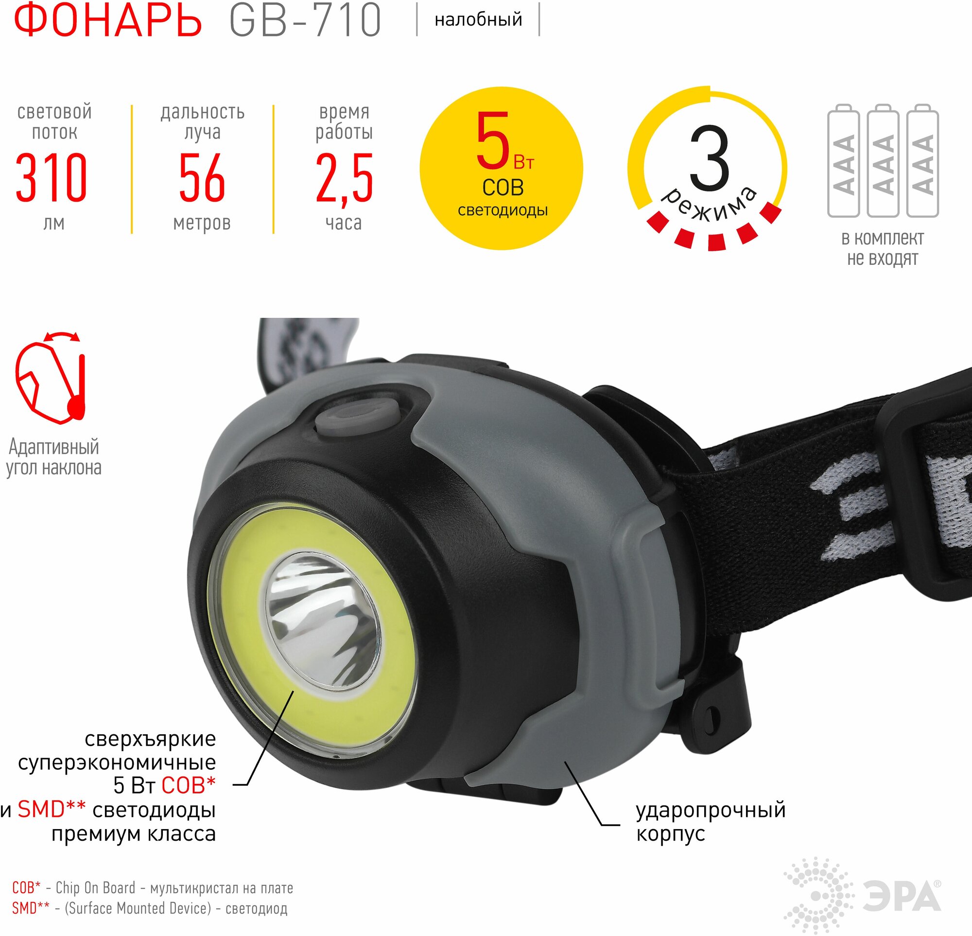 Type: headlamp, accessory type: mount, light source: LED, power type: battery, power consumption: -, features: high beam, daylight white light, shockproof housing, eco mode, shockproof