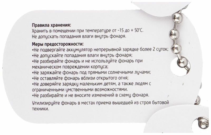 Type: hand lamp, light source: LEDs, power type: built-in battery, power consumption: from the mains, features: moisture protection, high beam, daylight white light, economy mode, luminous flux: 50 lm, far