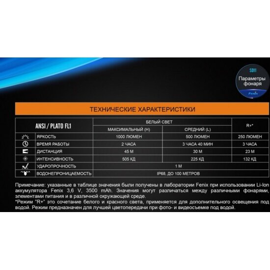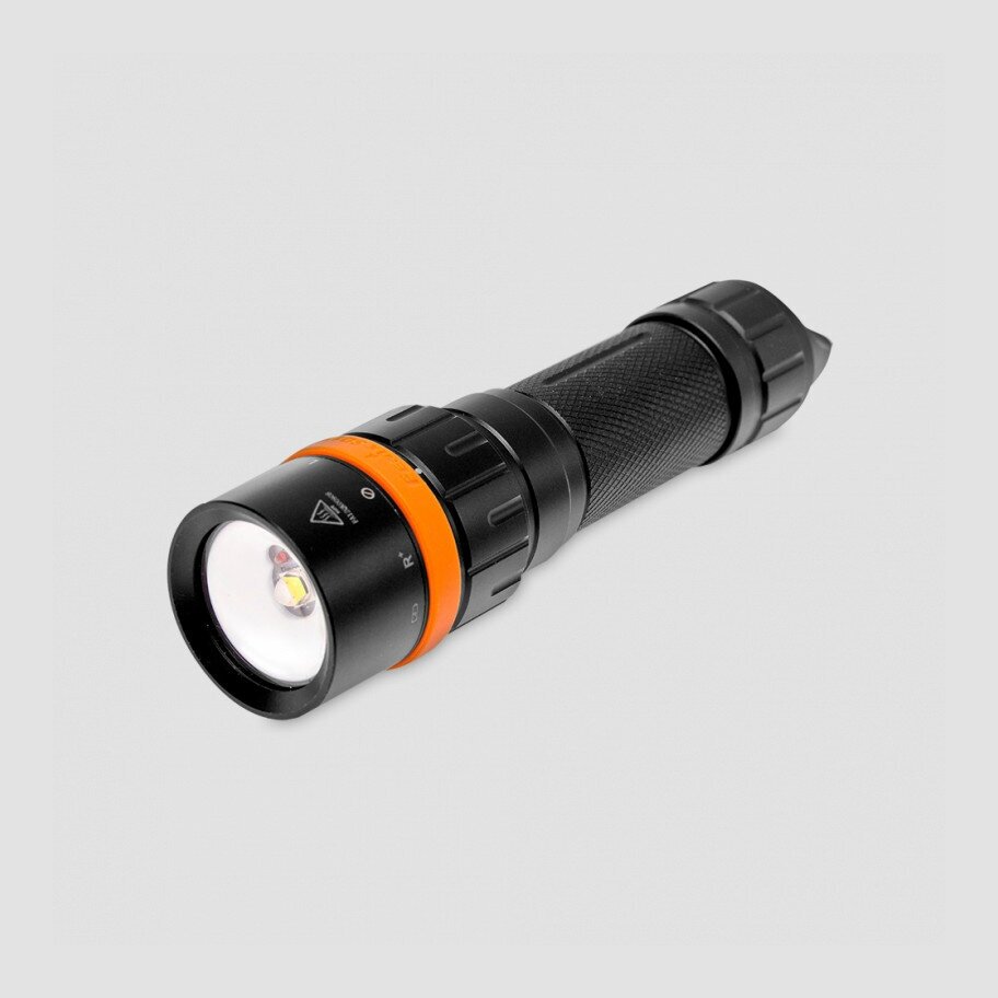Accessories: flashlight, wide diving strap, spare sealing ring, spare swivel ring, clip; battery type: ICR18650; number of batteries: 1; number of operating modes: 3