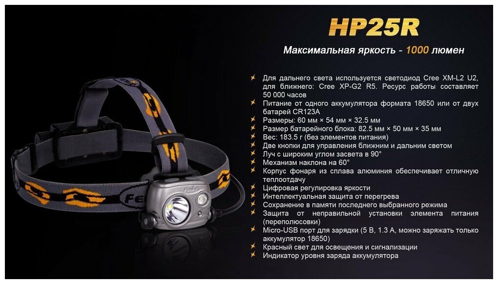 Type: headlamp, light source: LED, power type: battery, power consumption: USB, features: high beam, red light, turbo mode, shockproof housing, economy mode, luminous flux: 1000 lm, yes