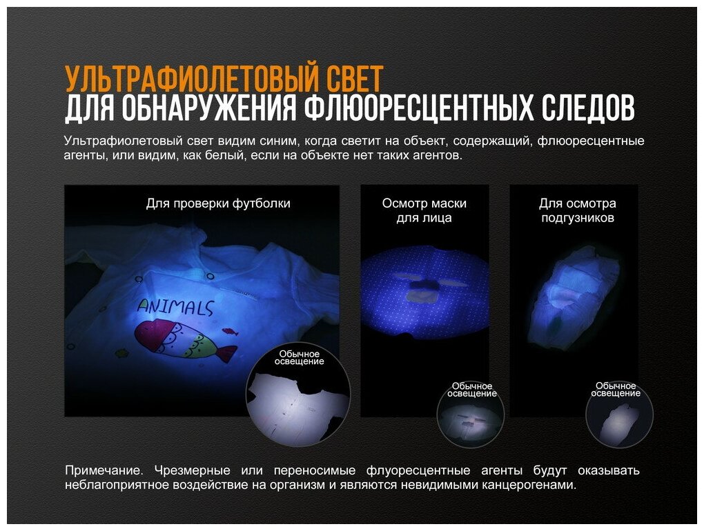 Ultraviolet glow mode; battery type: AAA; detailed equipment: - lantern;<br/> - AAA battery;<br/> - spare sealing ring;<br/> - instruction;<br/> - guarantee.; number of batteries: 1; number of operating modes: 4