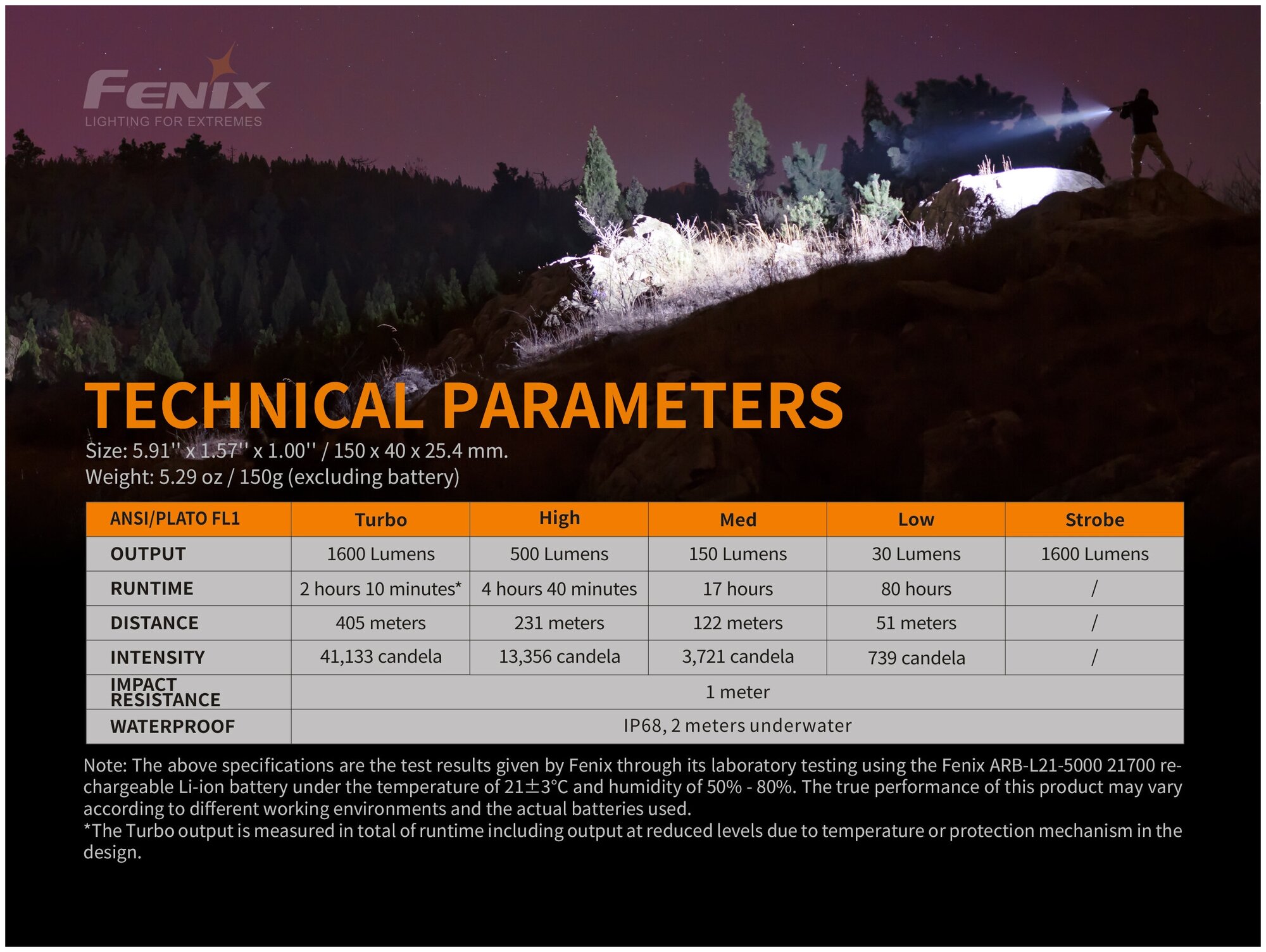 Battery type: ICR18650; detailed equipment: flashlight, clip, case, hand strap, spare rubber ring, adapter ALF-18, warranty card, instructions; number of batteries: 1; number of operating modes: 5