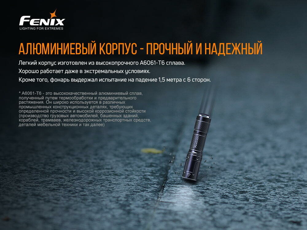 Battery type: AAA; detailed equipment: Flashlight Fenix E01 V2.0, AAA battery, key ring, spare sealing ring, user manual, warranty card; number of batteries: 1; number of operating modes: 3