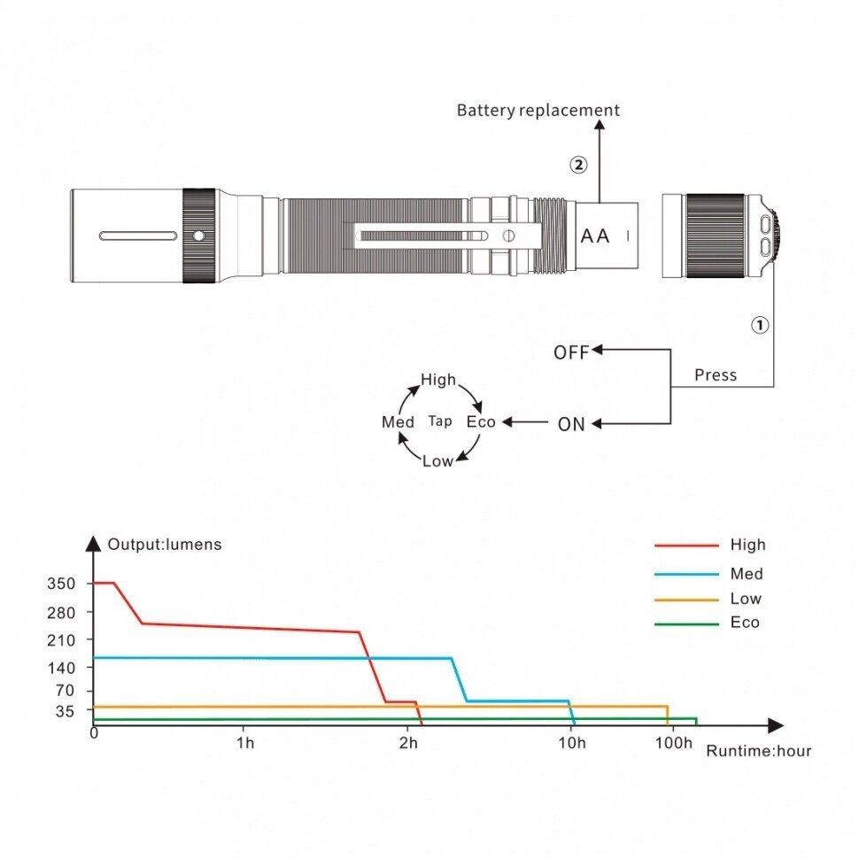 Battery type: AA; detailed equipment: flashlight E20 V2.0, two AA batteries, sealing ring, hand mount, information leaflet, user manual, warranty card; number of batteries: 2; quantity mode