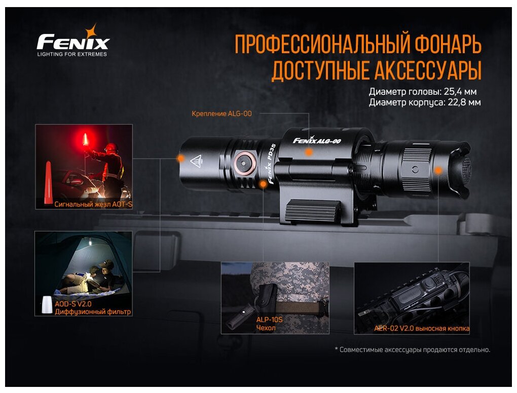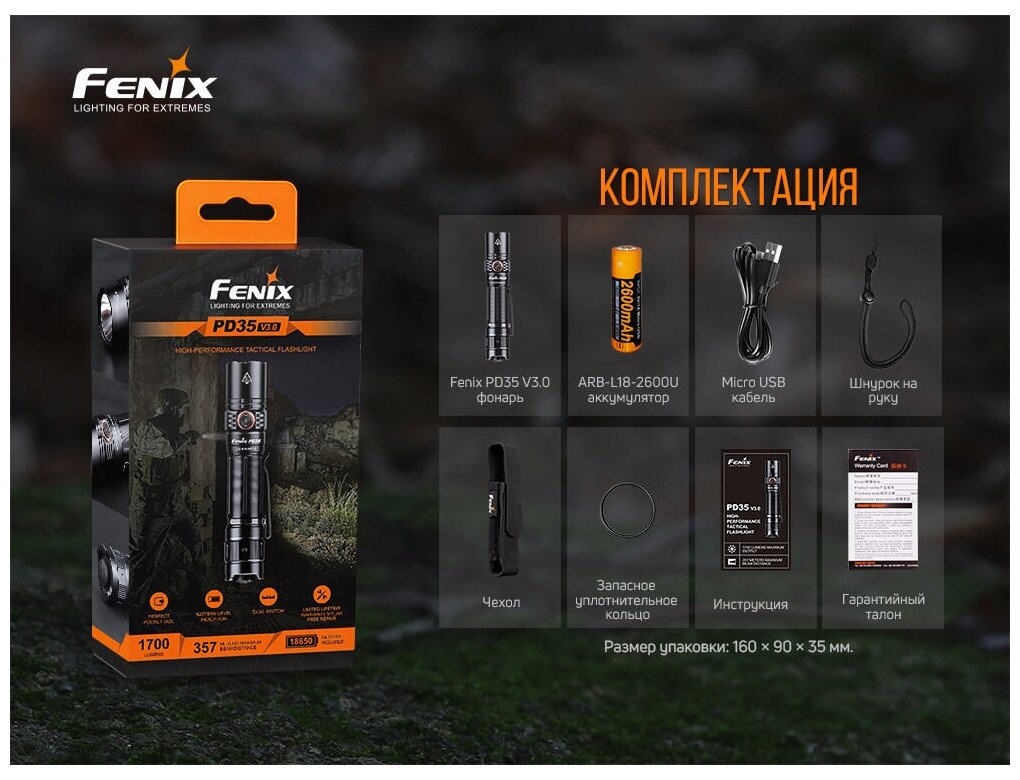 Luminus SFT40 diode, head diameter 25.4 mm, body diameter 22.8 mm; battery type: ICR18650; detailed equipment: Fenix PD35 V3.0 flashlight, case, hand strap, 2 spare O-rings, Micro-USB charging cable, battery